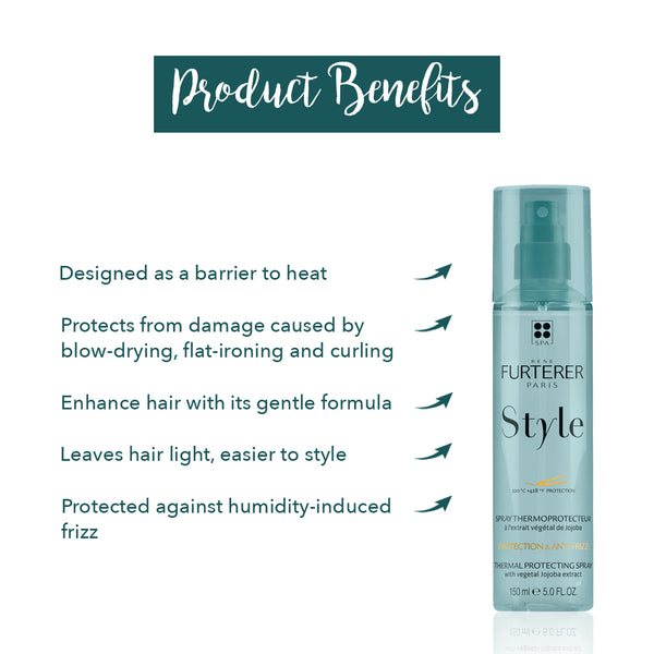 Designed as a barrier to heat, the Thermal Protecting Spray with Jojoba plant extract protects hair fiber from heat-styling damage caused by blow-drying, flat-ironing and curling up to 220°C while helping to preserve the hair fiber and enhance hair with its gentle formula. This invisible finish spray leaves hair light, easier to style, and protected against humidity-induced frizz.