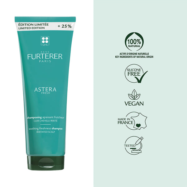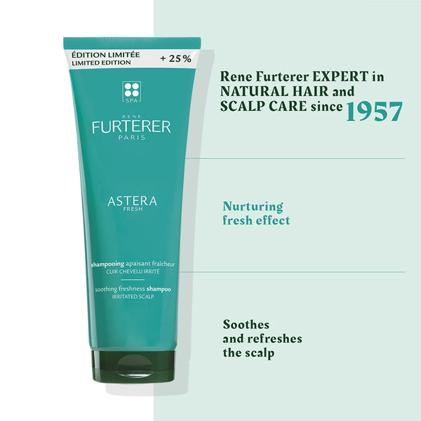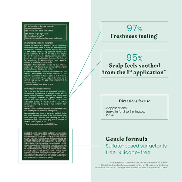 Damaged by external factors, the scalp is occasionally prone to itching, redness, and tightness. A true bath of soothing freshness, ASTERA SHAMPOO gently cleanses and soothes upon the first application thanks to the cooling effect of mint and eucalyptus essential oils. Rich in Asteraceae extract, it soothes irritation and itching to bring softness and suppleness to the scalp. Results: scalp is instantly soothed and experiences comfort. Hair is left soft, shiny, and easy to manage.