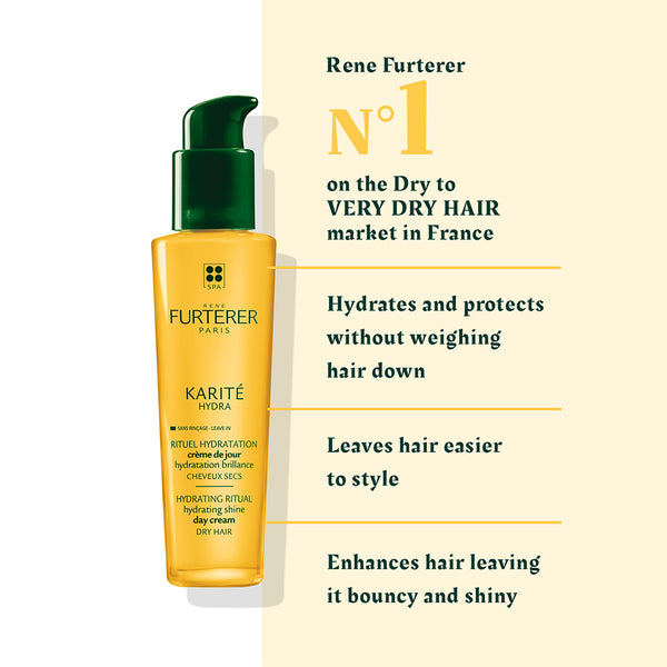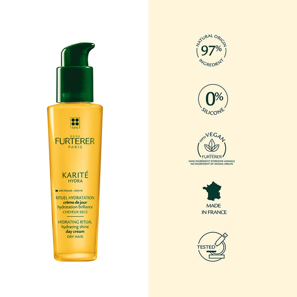 Karité Hydra hydrating shine day cream enhances dry, fragile hair with its creamy, non-greasy texture for optimum daily hydration. This leave-in conditioner instantly transforms the hair, leaving it soft, supple, shiny and weightless.